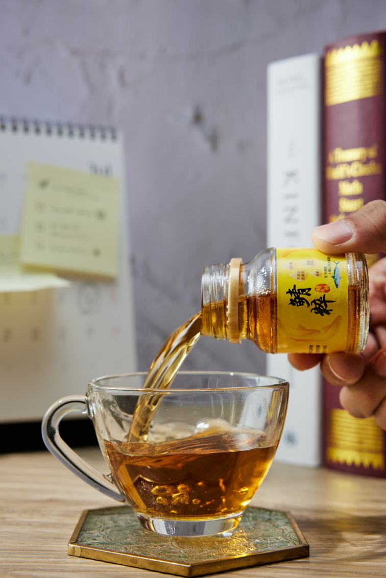 圖:鯖粹精華液以溫水沖泡後呈現琥珀色澤,口感溫潤,展現日常保健飲用的便利性與質感。圖/拾粹院提供